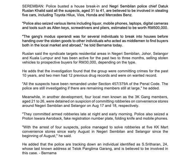 KL cops cripple two burglary and car theft syndicates, gang leader arrested