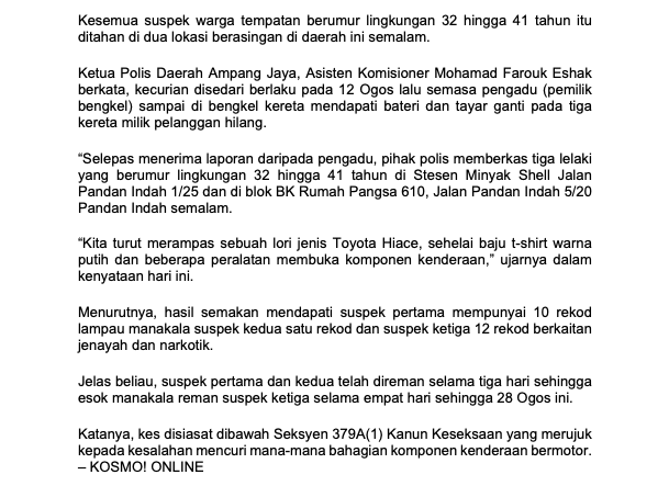 Tiga lelaki diberkas angkara curi komponen kereta milik pelanggan