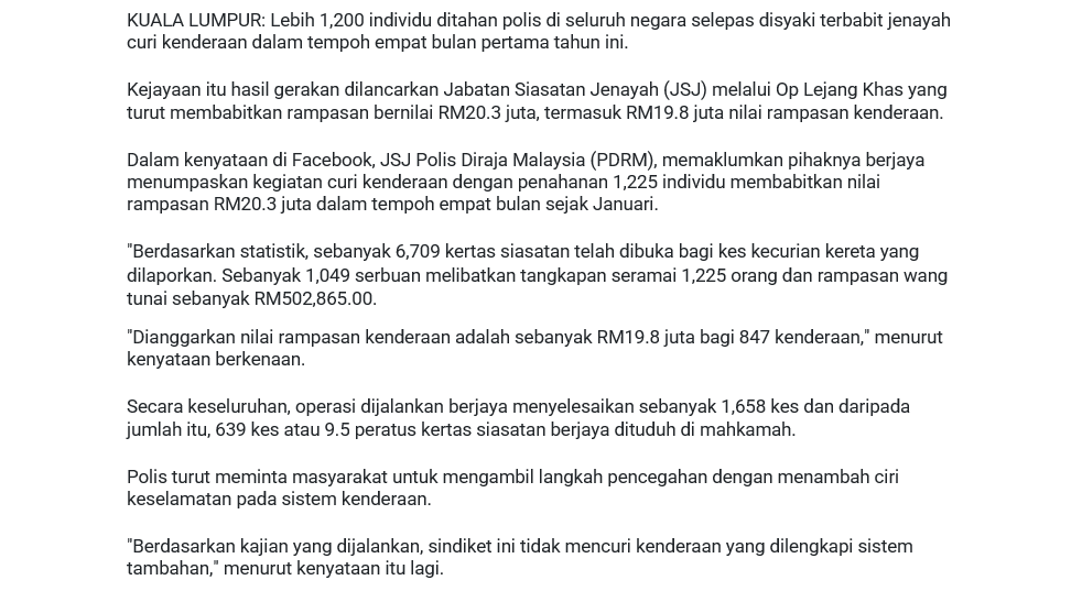 Polis tangkap 1,225 individu curi kenderaan, nilai rampasan RM20.3j