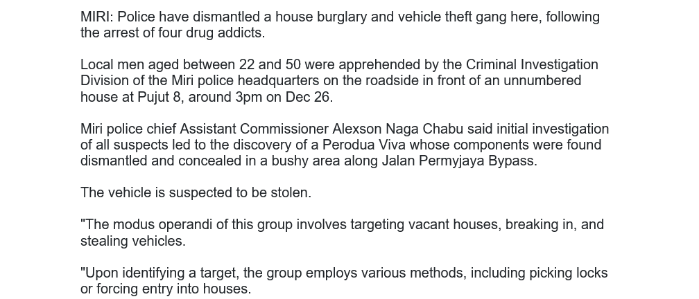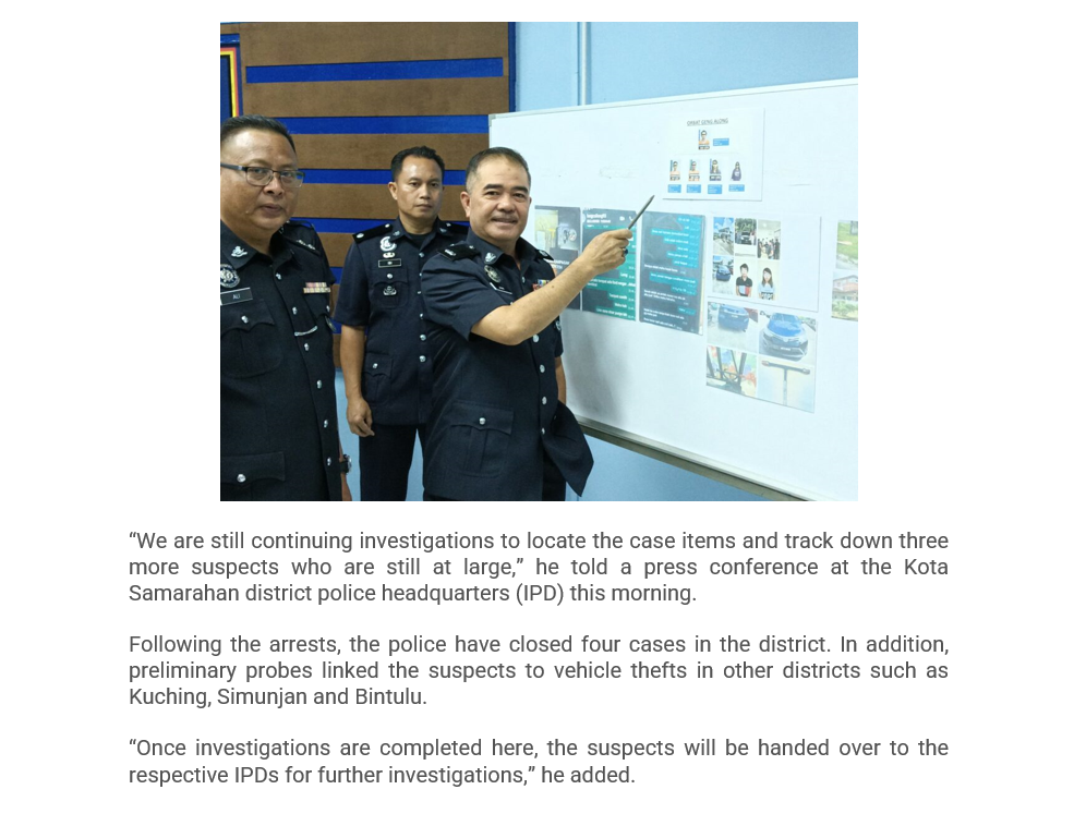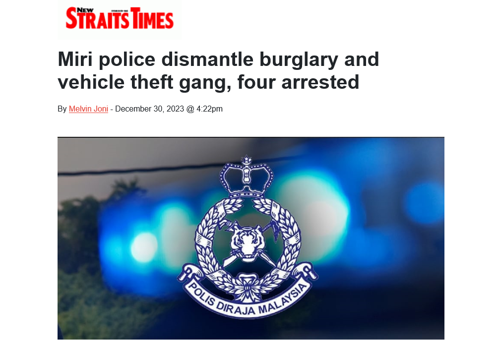 Miri police dismantle burglary and vehicle theft gang, four arrested