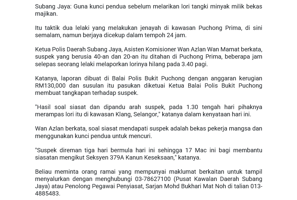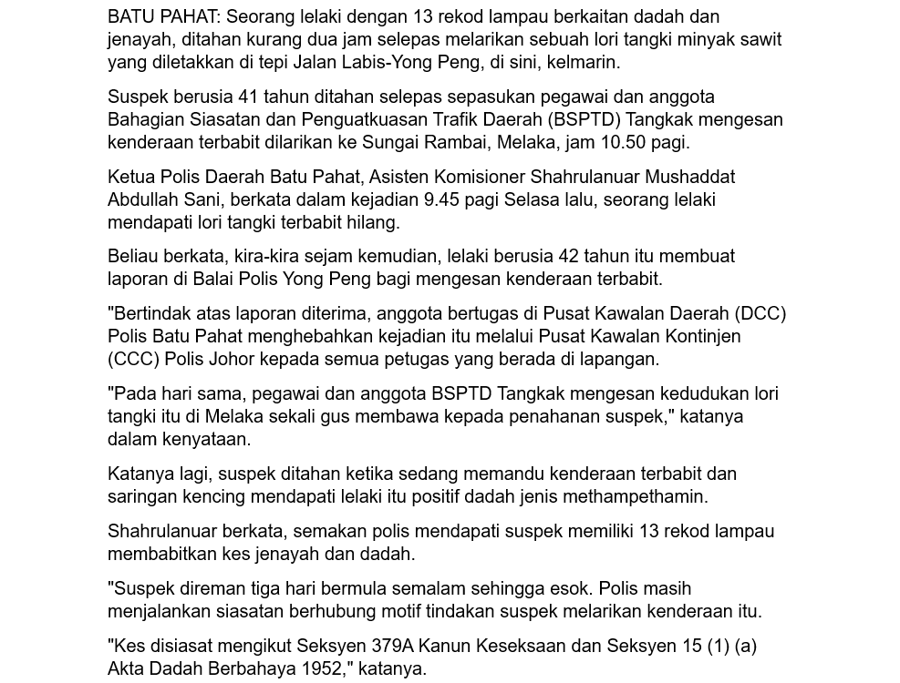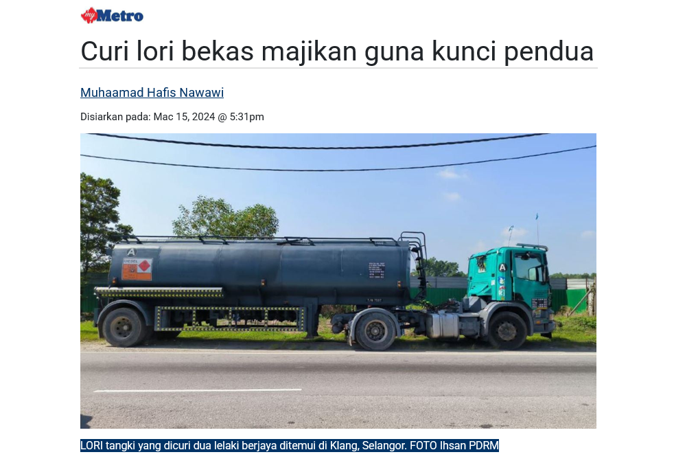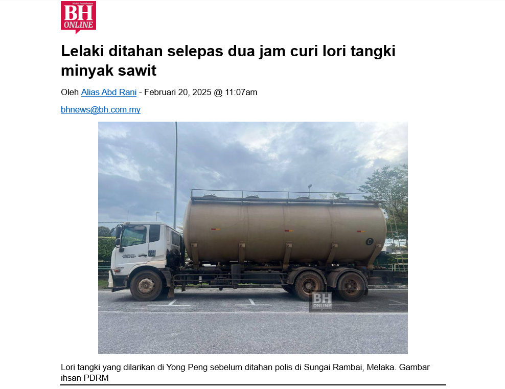 Lelaki ditahan selepas dua jam curi lori tangki minyak sawit