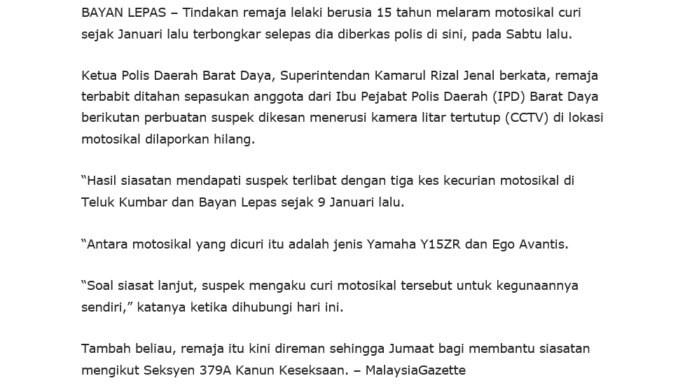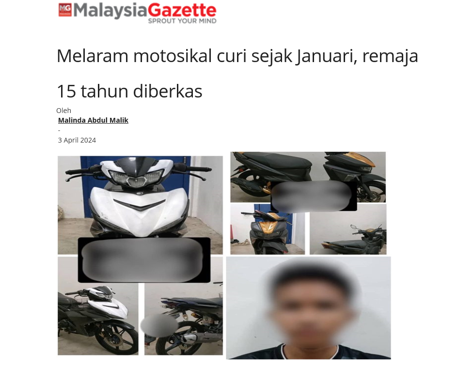 Melaram motosikal curi sejak Januari, remaja 15 tahun diberkas