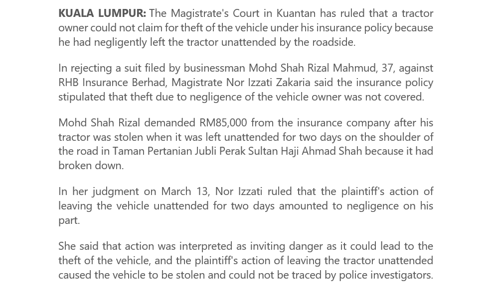 Court rejects insurance claim for tractor theft due to owner’s negligence