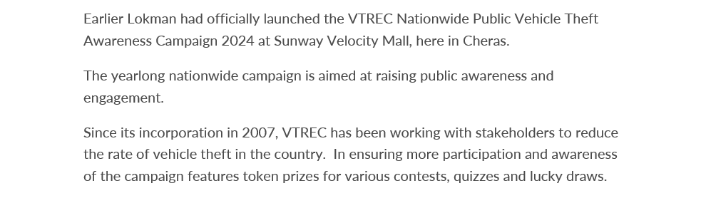 PDRM Vehicle Theft Awareness Campaign 2019 launched – raising awareness to reduce theft