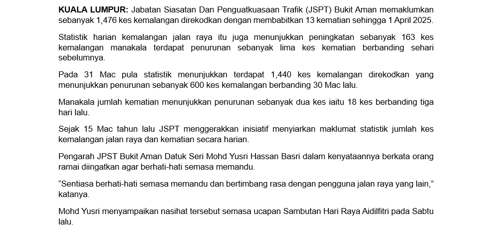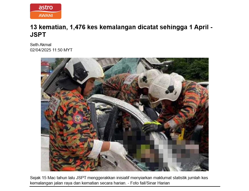 13 kematian, 1,476 kes kemalangan dicatat sehingga 1 April – JSPT