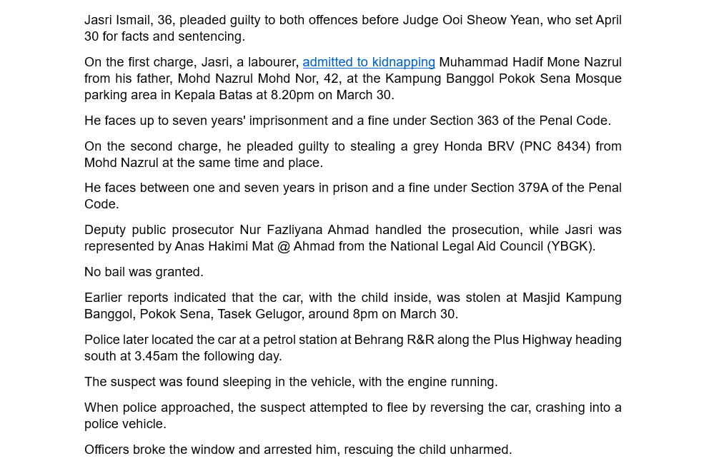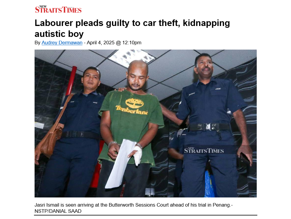 Laborer pleads guilty to car theft, kidnapping autistic boy