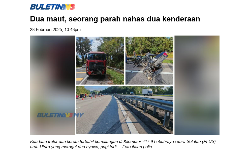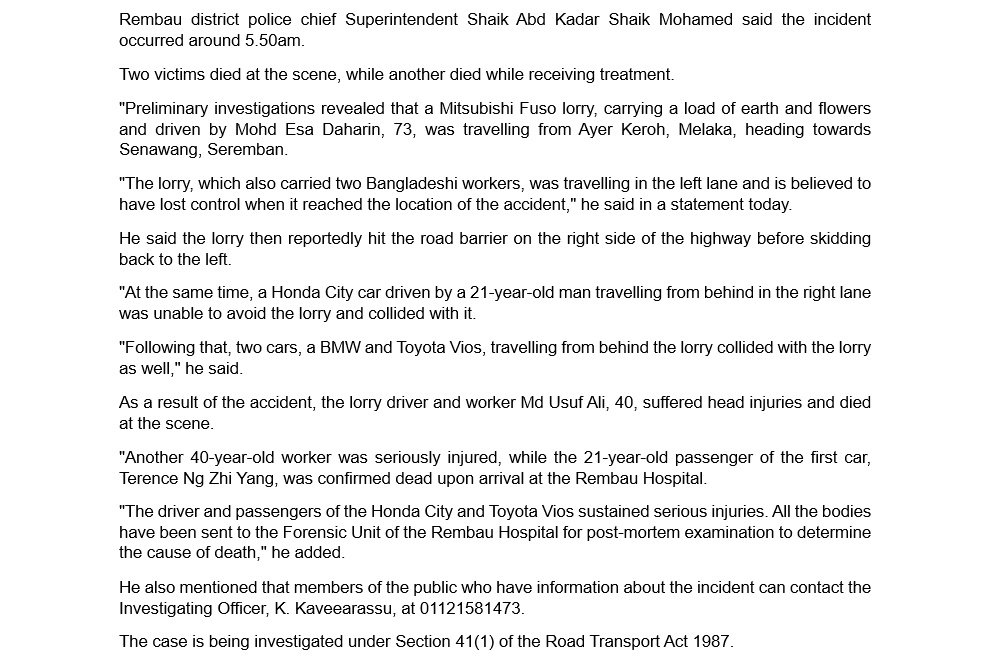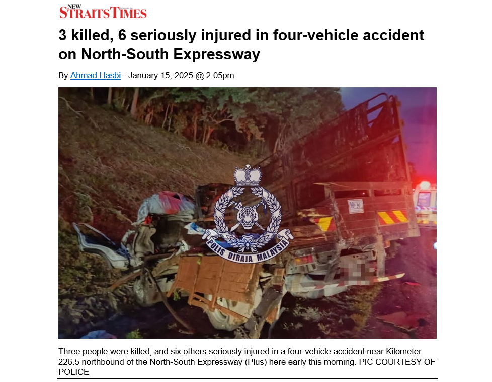 3 killed, 6 seriously injured in four-vehicle accident on North-South Expressway