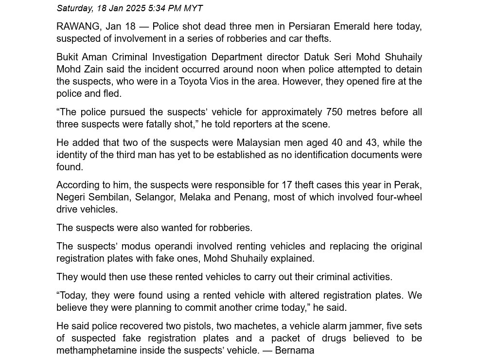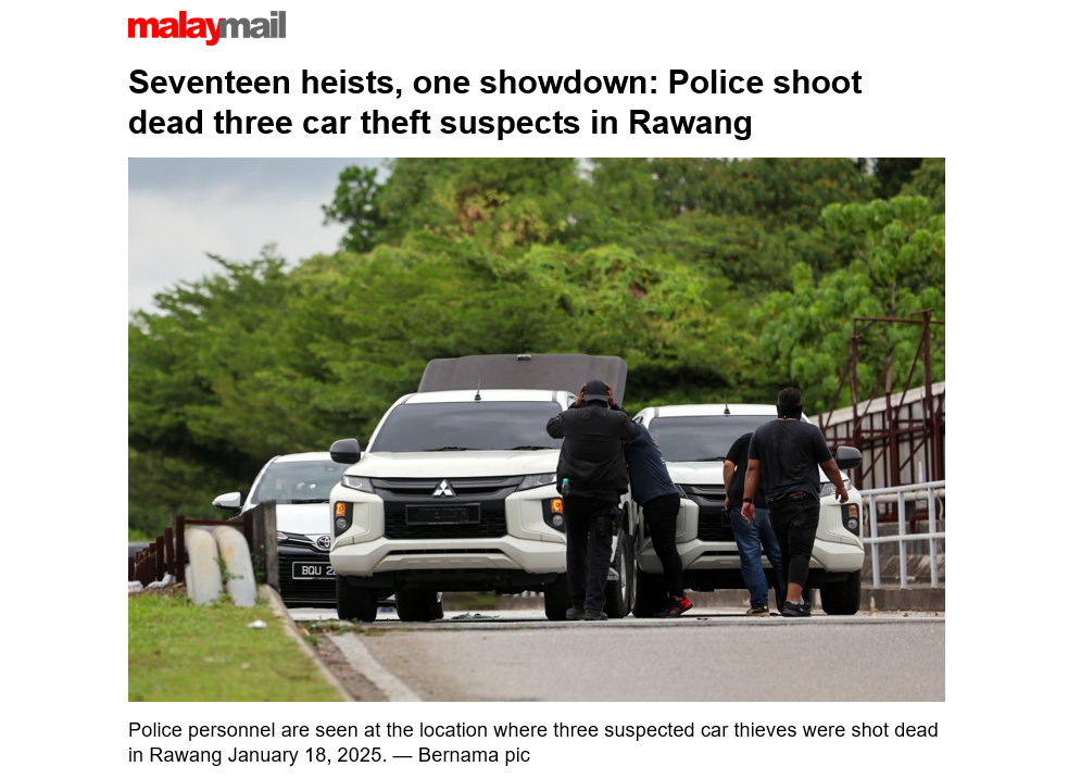Seventeen heists, one showdown: Police shoot dead three car theft suspects in Rawang